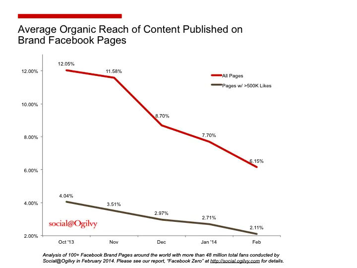 Further research from Social@Ogilvy suggests that for pages with more than 500,000 likes, organic reach could be as low as 2%!